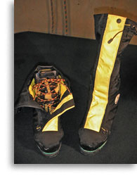 Gaiters should be used with all boots and it is important that the gaiter fit the boot properly. There are two types of gaiters. Supergaiters fit over the entire boot upper, covering down to the welt. These can be insulated or un-insulated and they are warmer than conventional gaiters which cover the top of the boot only. Gaiters for most Adirondack ice climbing should cover the lower- leg up to the knee. Shorter gaiters are nice on summer glaciers or in spring snow conditions, but they can allow deep, soft snow to enter your boots not good. If you have boots other than the warmest plastic double-boots we suggest you use an insulated supergaiter with a rubber rand most of the time. If you have top quality plastic double-boots a conventional gaiter will suffice, but we sometimes use an insulated supergaiter anyway. Waterproof- breathable fabrics don’t help much for ice climbing gaiters; we prefer ballistic or cordura nylon for their durability. We have a limited number of ice climbing boots (with gaiters) available on first-come first-served rental basis. If you are considering this option you should check with us regarding size, availability and cost.