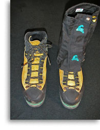 Warm (25º+ F) La Sportiva, Trango Extreme single-boot (fit snug) and short alpine gaiters