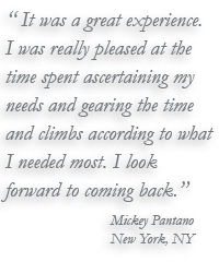 You will not find specific routes listed, or described, in this web site. We believe that featuring specific climbs promotes overcrowding, which is contrary to Our Values. Nearly all of the photos found in this web site were taken during our programs and they should serve to give you a general idea of the resources we have to offer. For the specifics, you will need to contact us directly. Then, we can discuss climbing routes tailored to your interests and abilities.