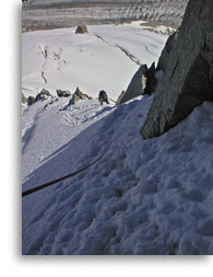 After climbing with us for a couple of days you will have a clear picture of our expectations and we will have a clear picture of your abilities. Only after a guide and client get to know one another does it make sense for them to plan and undertake demanding objectives. All technical climbing requires you to literally place your life in the hands of your partner. Doing so without direct knowledge of that person's attitudes and abilities is foolish, no matter what their experience or credentials might include. This is as true for the guide as it is for the client.
