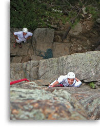 The second day starts with a bouldering session; an opportunity for you to build your movement technique repertoire. Next, we introduce and practice techniques for placement and removal of “clean” protection. Afterwards, you’ll have a chance to further practice these skills while learning to follow more challenging one-pitch climbs. Your instructor will place protection while leading these routes, then you will follow, removing equipment as you climb. This leading/following sequence is fundamental to all technical rock and ice climbing and opens the door to bigger climbs.