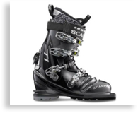 If you are considering alpine touring boots for backcountry use we suggest getting a lightweight boot that is compatible with Dynafit’s lightweight binding system. Dynafit compatible boots can usually be used in other binding as well. Manufacturers include Dynafit, Garmont, Scarpa, Black Diamond, K2 and a few others. Alpine touring boots were, for a long time, too heavy and clunky for anything other than short jaunts into the backcountry. New designs, materials and the Dynafit binding system changed that and these boots now create a viable option to nordic setups for the most challenging backcountry skiing. These boots usually have two buckles. Some of these boots also work fairly well for climbing with crampons and thus they have replaced climbing boots for some ski mountaineering.