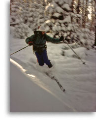 The second day will be devoted to applying the skills introduced on the first day to skiing situations encountered along a classic backcountry tour. We'll use the telemark turn both on and off trail to acheive better control than would be possible with other techniques. We’ll also cover the use of climbing skins for long uphill stretches. Boots, bindings and skis must provide good support for you to learn the skills we present in this couse. Required equipment for this course is discussed on our Ski Equipment page.