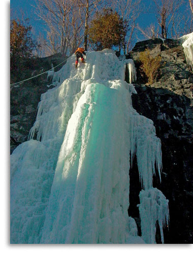 Although there is almost always water available, sometimes it is slow to freeze because the water flows too quickly or there is too much flow. Compared to other water sources, waterfalls generally require colder temperatures over a longer period of time to produce good ice. Once frozen, however, waterfalls frequently make for fabulous ice climbing. Barring warm temperatures, they also tend to build up quickly often resulting in a “new” climb every day or so. Because water often continues to flow beneath the ice, extra caution is in order to avoid a mid-winter shower (or worse, a swim!).